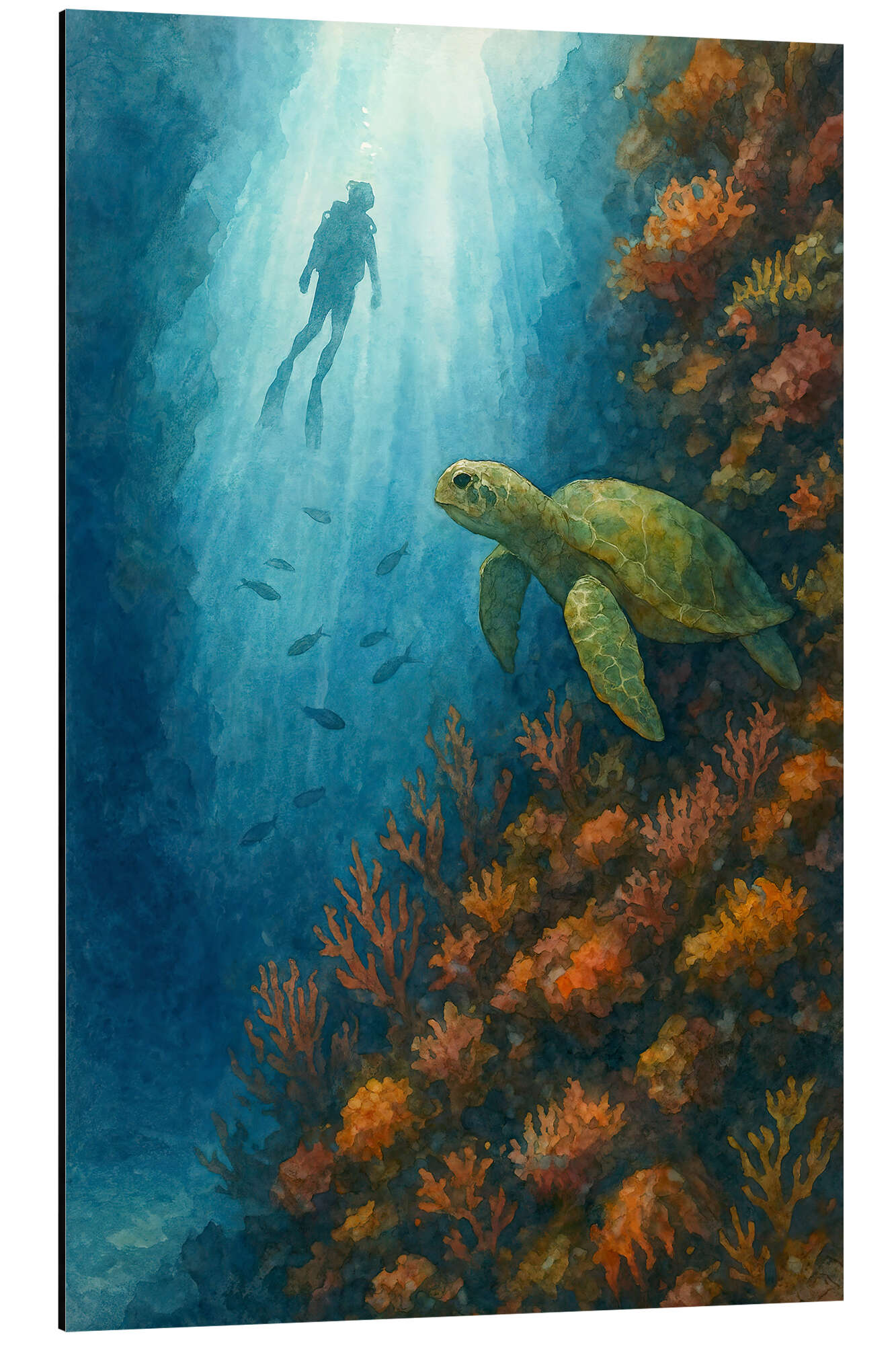 Posterlounge   Tableaux   Nature   Monde sous-marin   Natalie Bruns   Tableau en aluminium Scuba diver with sea turtle on coral reef