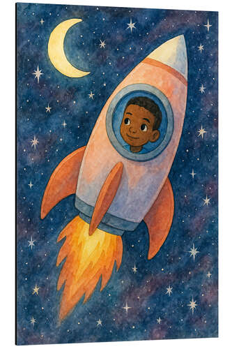 Posterlounge   Tableaux   Bleu   Natalie Bruns   Tableau en aluminium Boy flying in rocket ship through the stars